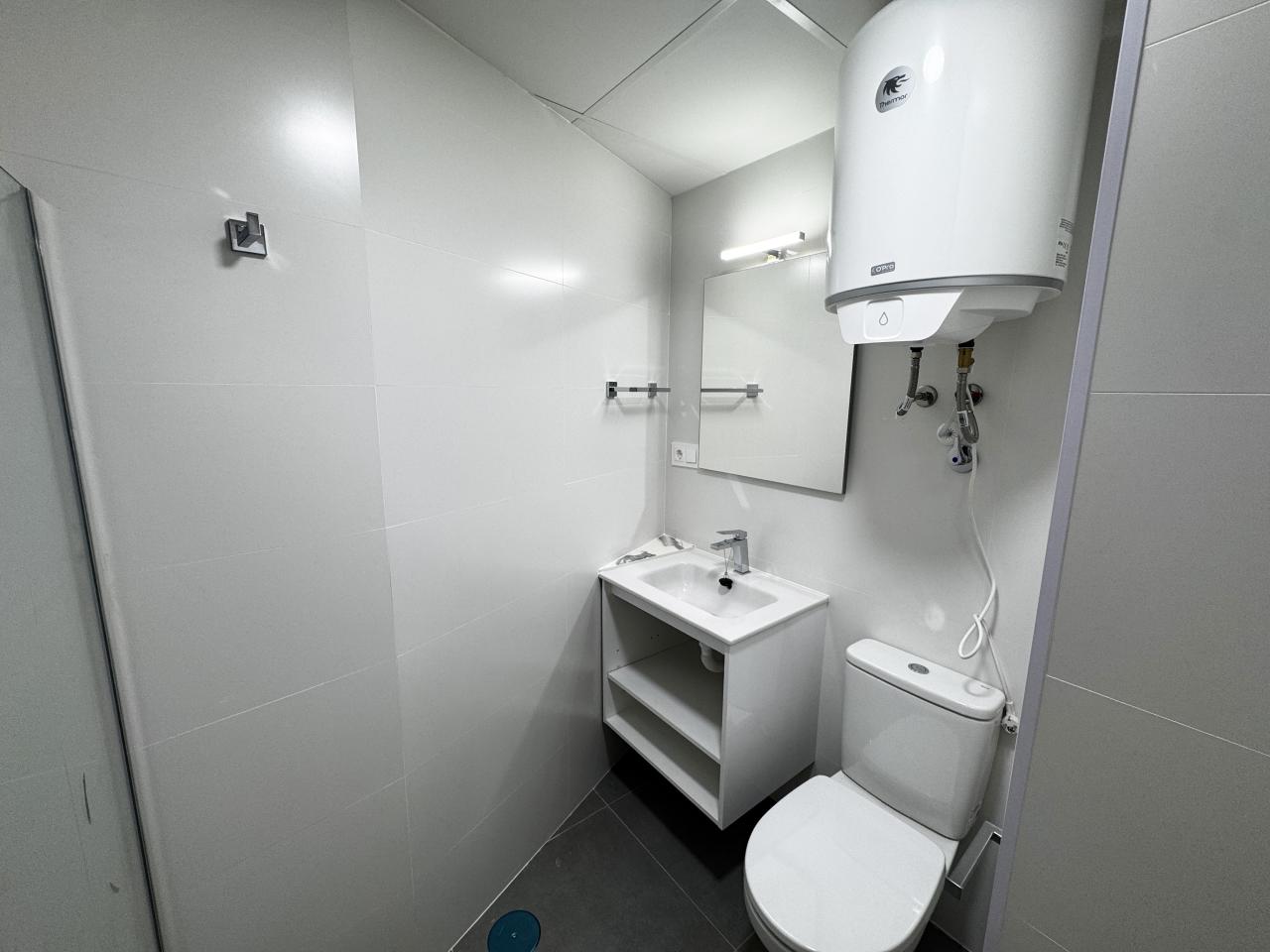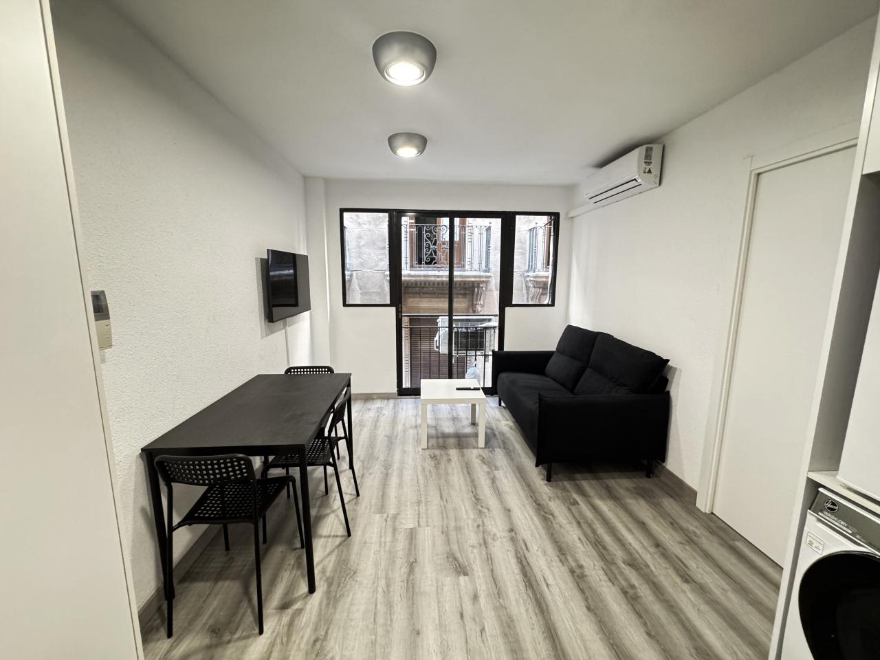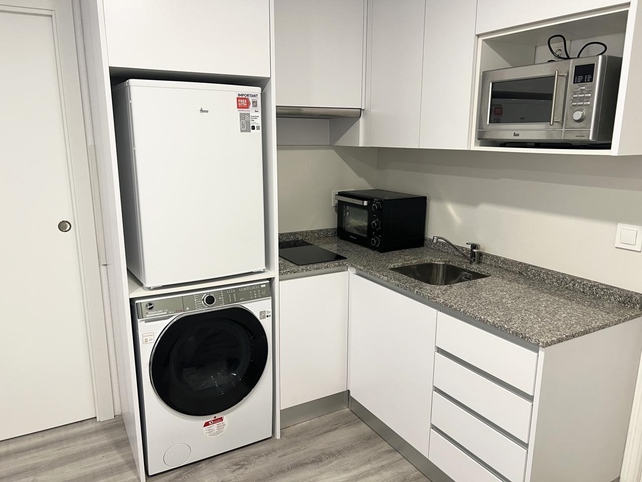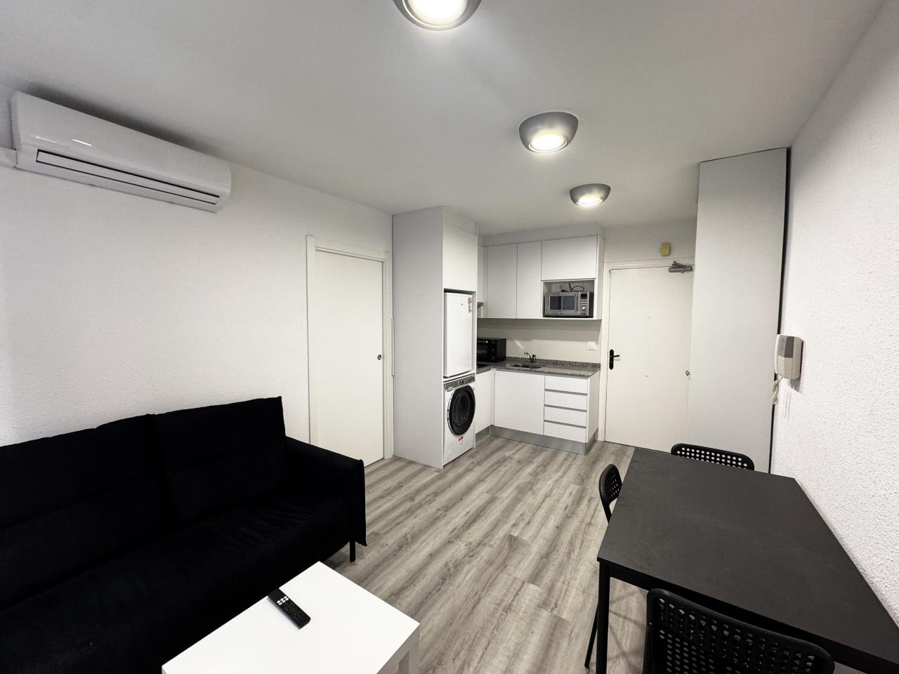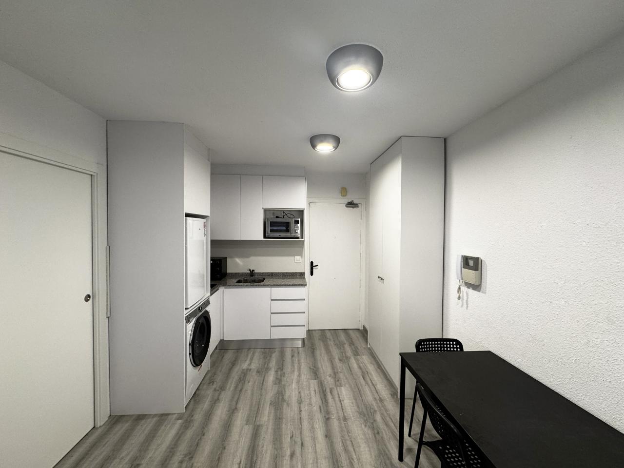 La vivienda se distribuye en una zona de día diáfana, donde la cocina —totalmente equipada y con soluciones de almacenamiento optimizadas— se integra con el salón-comedor, generando un espacio equilibrado y luminoso. De manera independiente, encontramos el dormitorio, que cuenta con baño, aportando privacidad y confort.
