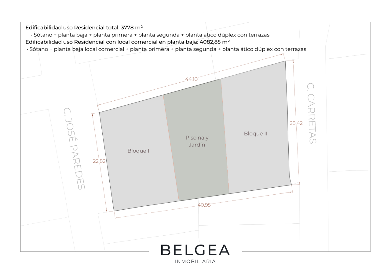 El volumen edificable alcanza hasta 3.778 m² en uso residencial, pudiendo ampliarse hasta 4.082,85 m² en desarrollo mixto, lo que permite configurar un producto inmobiliario altamente competitivo. Esta capacidad facilita el diseño de viviendas en varias alturas, incluyendo la posibilidad de áticos tipo dúplex con amplias terrazas, una tipología muy demandada y con alto valor añadido.